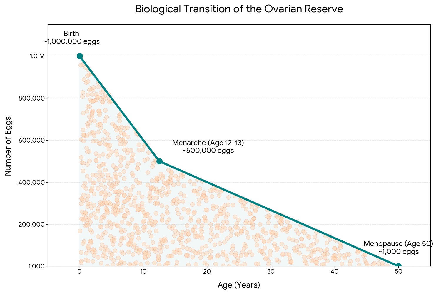 A woman is born with around 1 to 2 million eggs, and this reduces to about 300,000 to 500,000 by puberty. Over time, the number continues to decline naturally as about 1000 of these are used in each menstrual cycle to produce one egg.